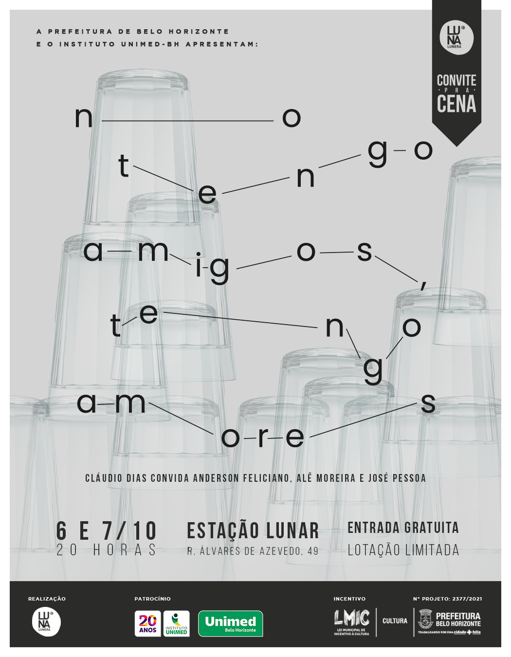 O lunero Cláudio Dias convidou para a criação da cena “No tengo amigos, tengo amores”, o escritor, dramaturgo, performer e curador, Anderson Feliciano; o produtor musical, DJ e integrante do coletivo Salto Sound System, Alê Moreira; e o arquiteto, pesquisador, professor e orientador no campo da urbanização do corpo, da sociedade e do espaço, José Pessoa.